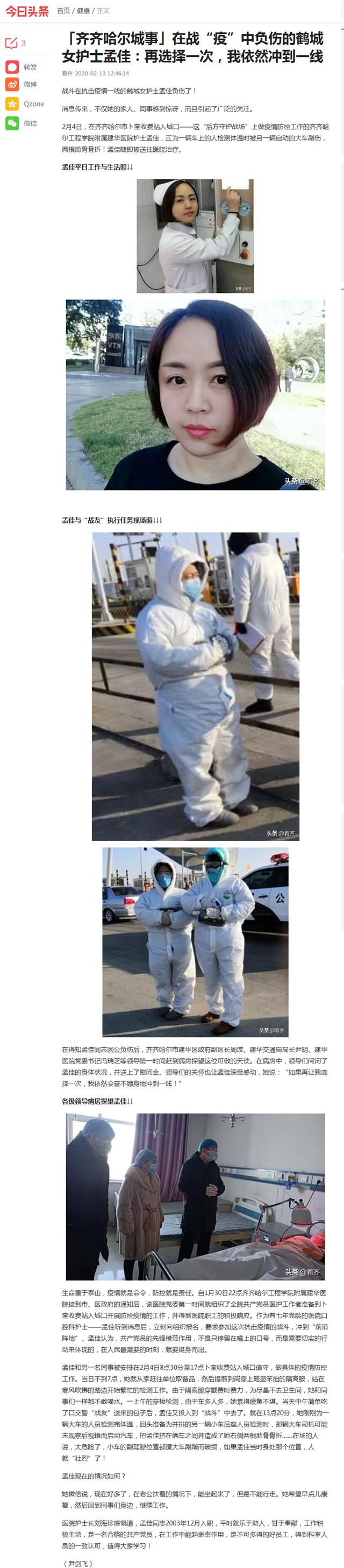 今日头条《齐齐哈尔城事》:在战“疫”中负伤的鹤城女护士孟佳:再选择一次,我依然冲到一线