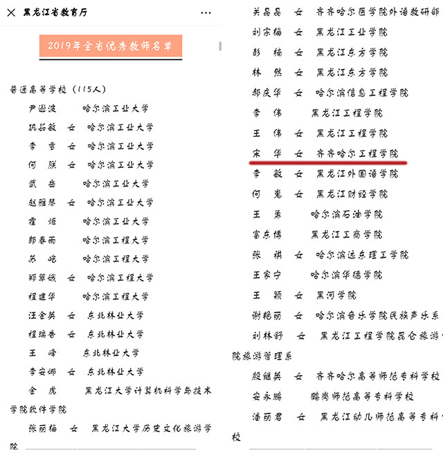 黑龙江省教育厅微信公众号报道学院教师宋华荣获“2019年全省优秀教师”称号
