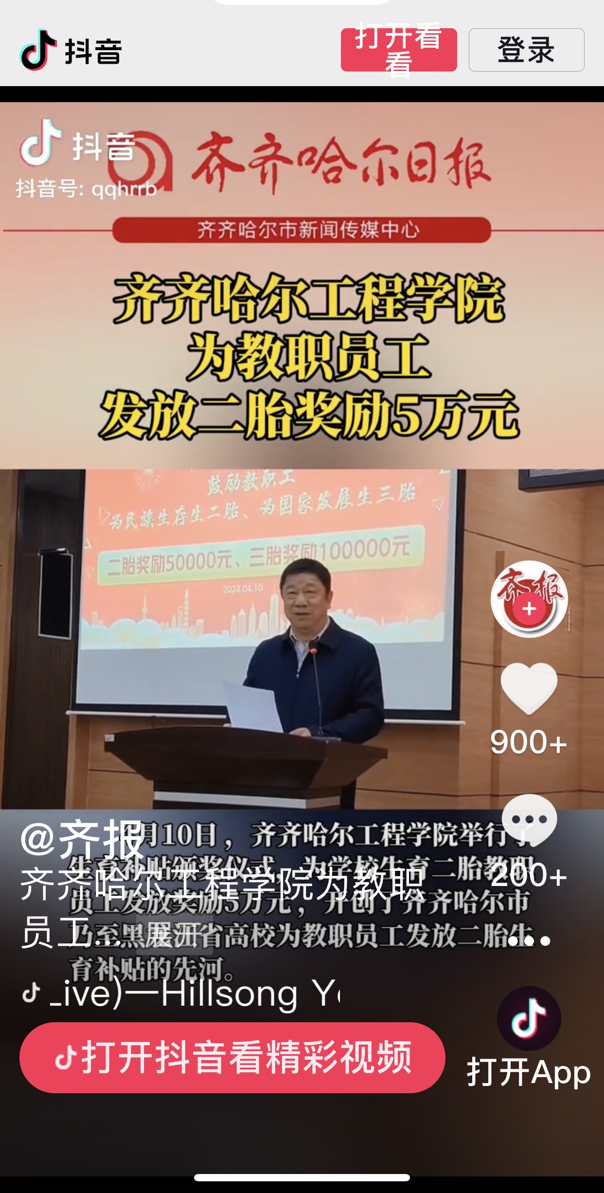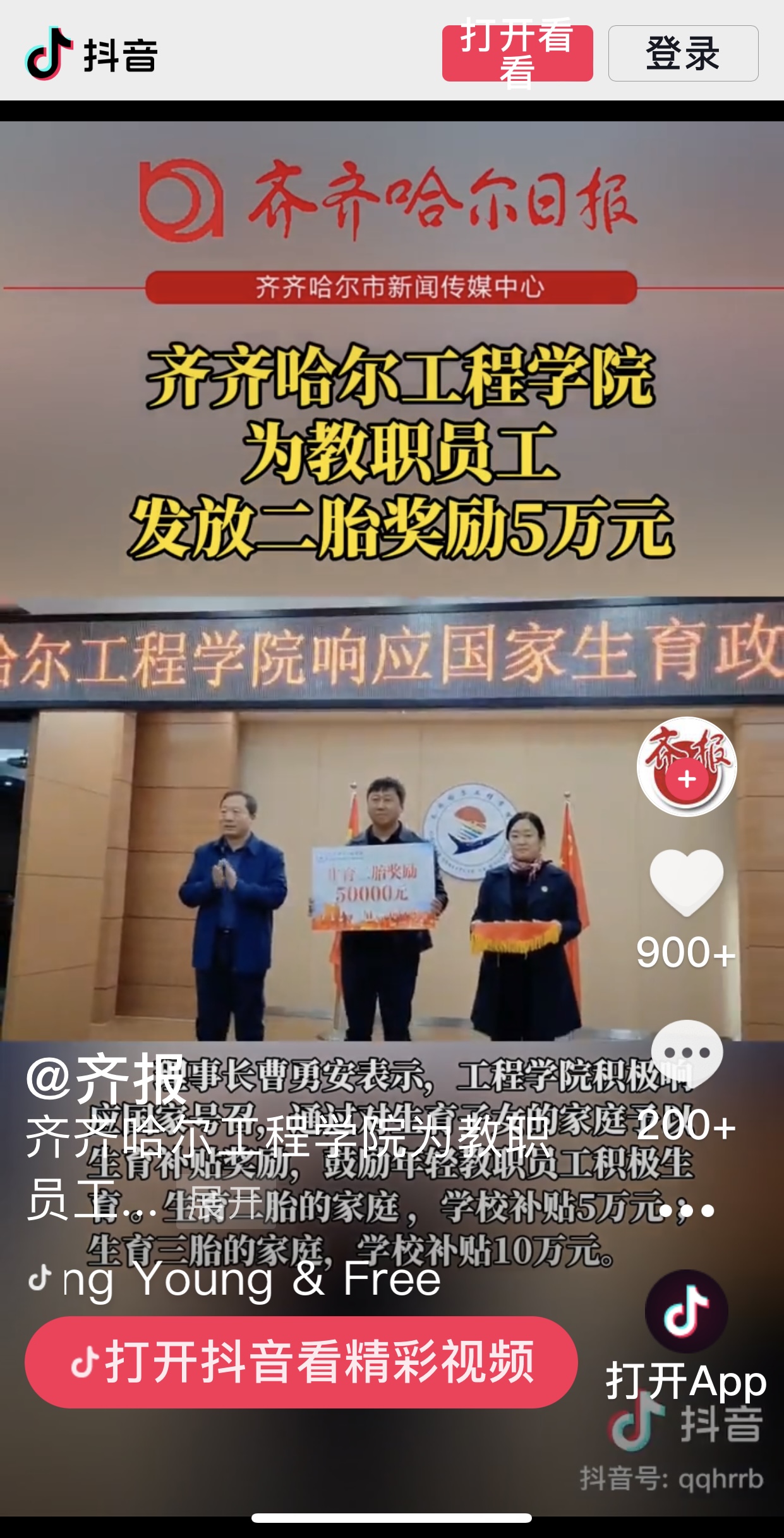 《抖音.齐报》播出永利23411集团官网为教职员工发放二胎奖励5万元视频