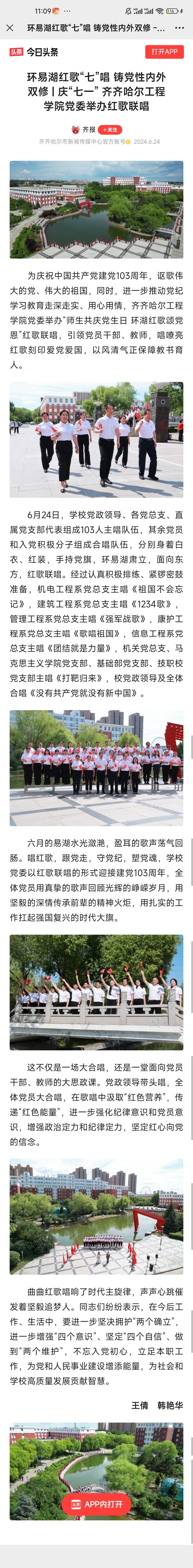 《今日头条》(齐报)报道环易湖红歌“七”唱 铸党性内外双修 庆“七一”永利23411集团官网党委举办红歌联唱
