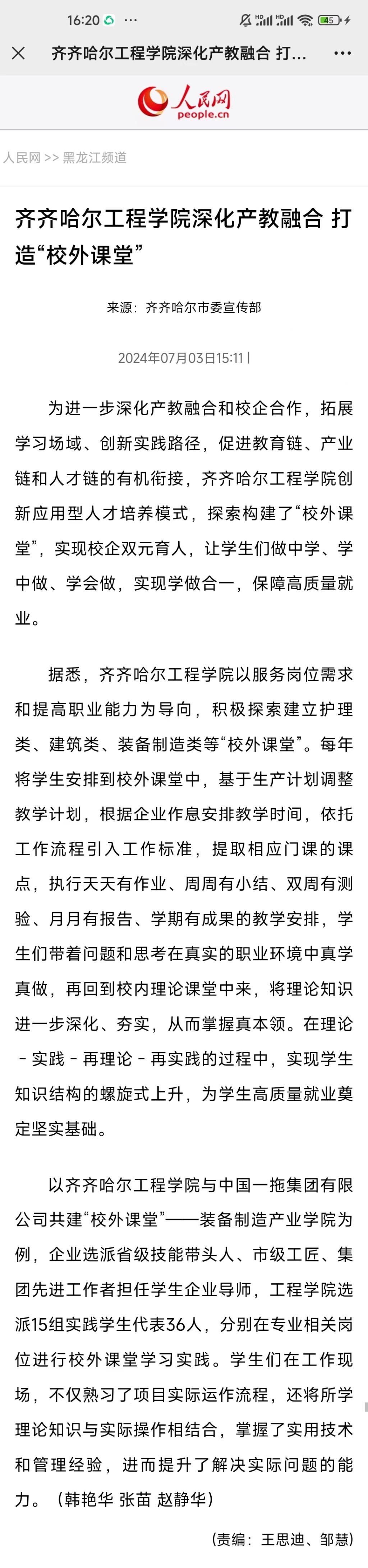 《人民网》报道永利23411集团官网深化产教融合 打造“校外课堂”
