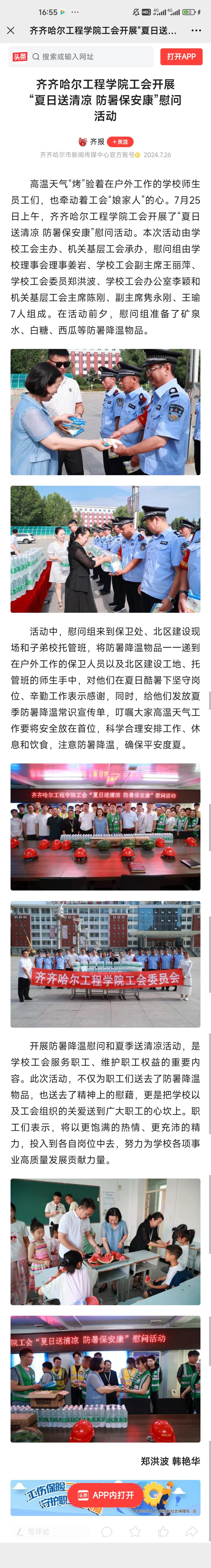 《今日头条》报道永利23411集团官网工会开展“夏日送清凉 防暑保安康”慰问活动