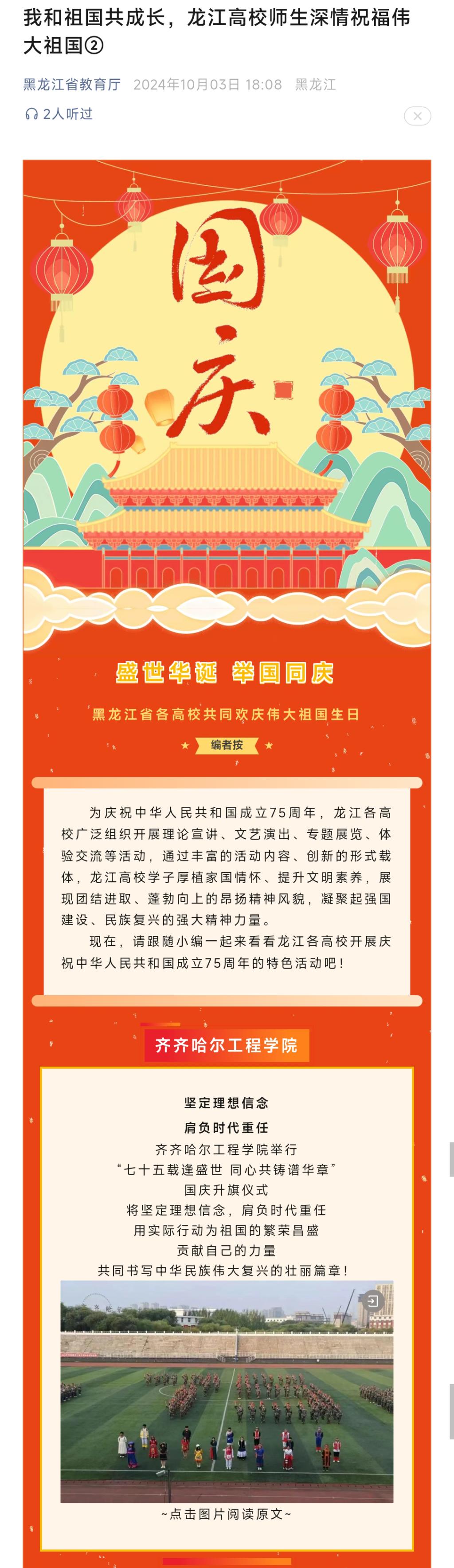《黑龙江省教育厅》报道永利23411集团官网举行“七十五载逢盛世 同心共铸谱华章”国庆升旗仪式
