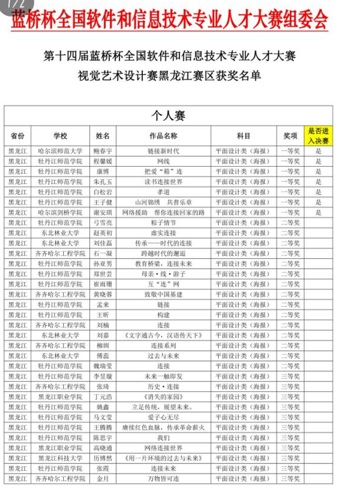 近日,第十四届蓝桥杯全国软件和信息技术专业人才大赛——视觉艺术设计赛黑龙江赛区比赛结果公布:永利视觉传达设计专业2020级学生石一凝、黄晓蓉等4名学生获得平面设计类二等奖,张琦、金月等5名学生获得平面设计类三等奖。