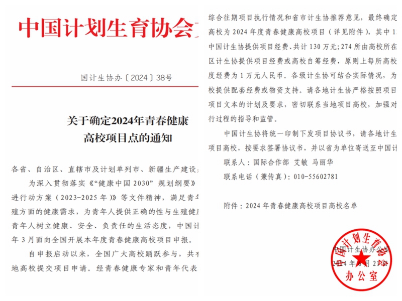 近日,中国计划生育协会发布《关于确定2024年青春健康高校项目点的通知》,学校团委申报的“以青春为浆,赴健康之约”青春健康项目在众多高校中脱颖而出,成功入选中国计划生育协会2024年全国高校青春健康项目,并提供专项经费支持。这是永利第1个全国大学生青春健康高校项目,此前的2020年,此项目永利已成功申报省级青春健康项目并结项。