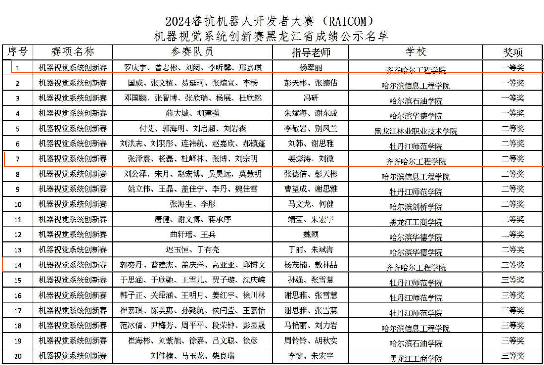 近日,2024睿抗机器人开发者大赛(RAICOM)机器视觉系统创新赛黑龙江省赛区省赛在哈尔滨华德学院圆满结束。永利机电工程系机器人工程专业共计3组、15名学生参与了此次比赛,最终斩获一等奖1项、二等奖1项、三等奖1项。其中,获得一等奖和二等奖的小组将于8月18日至26日,赴杭州市余杭区继续角逐全国总决赛。