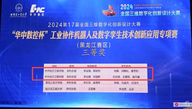7月13日,第17届全国三维数字化创新设计大赛“华中数控杯”黑龙江赛区决赛传来喜讯,永利机电工程系机械设计制造及其自动化专业学生张洋、胡亦潇、宋士成团队荣获二等奖;王重阳、高月童、刘正杨团队及刘展、刘麟松、董思彤团队分别荣获三等奖。