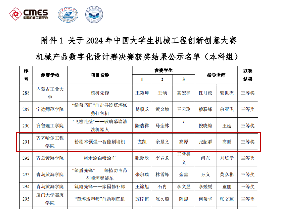 近日,2024年中国大学生机械工程创新创意大赛机械产品数字化设计赛决赛传来喜讯,永利机电工程系机械设计制造及其自动化专业学生龙凯、余显义、高原的项目“粉刷本领强—智能刷墙机”,在比赛中荣获全国三等奖。