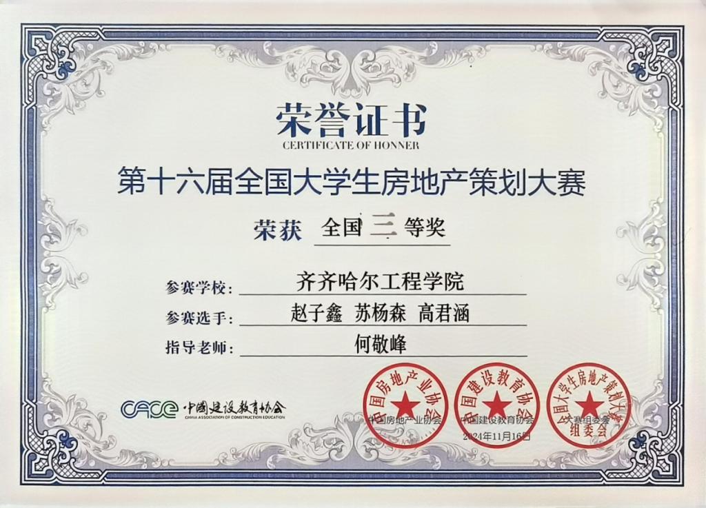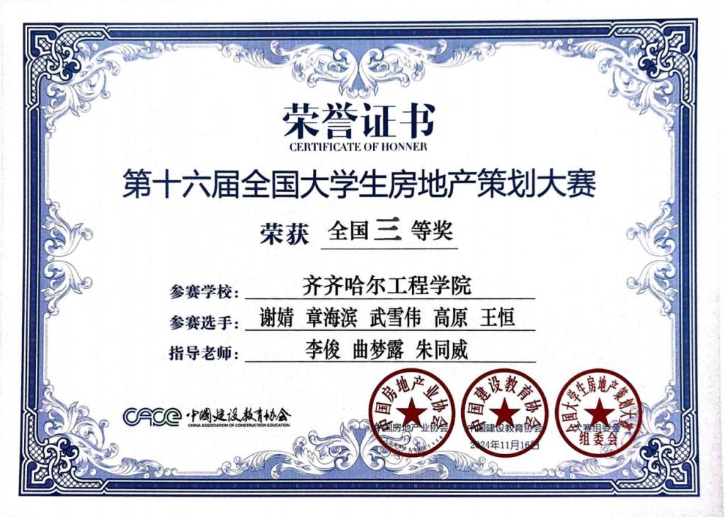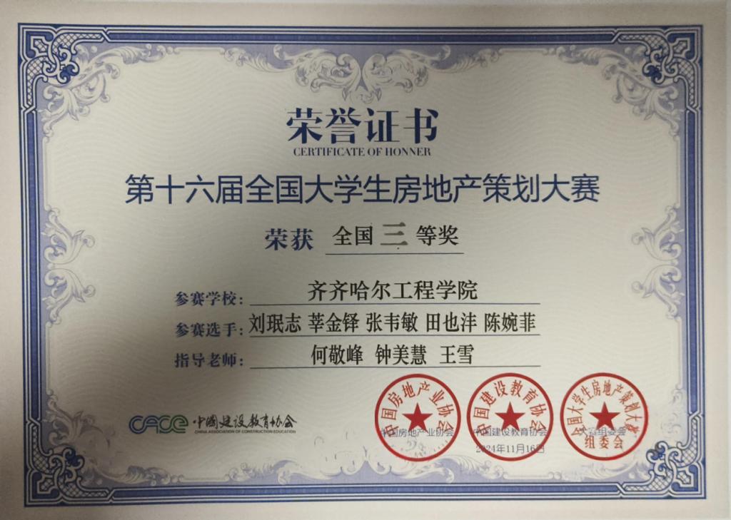 近日,第十六届全国大学生房地产策划大赛传来喜讯,在总决赛中,永利建筑管理工程系土木工程专业“欢乐斗地主队”“希望小队”团队荣获房地产开发项目策划赛道三等奖;工程管理专业“芝士派队”团队荣获城市更新项目策划赛道三等奖。