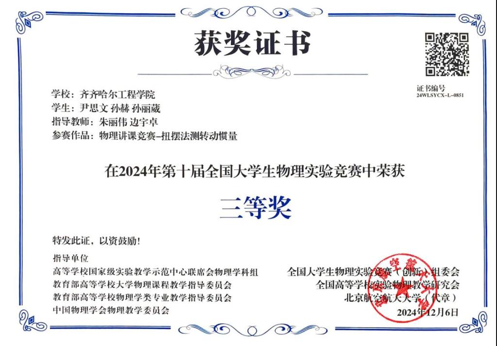 物理教研室以大学物理实验室、大学物理虚拟仿真实验室为平台,将该赛事作为大学物理实验课程的课外拓展,锻炼了学生的实践能力。长期以来,基础部高度重视学生创新精神和实践能力培养,本次全国大学生物理实验竞赛的成功参与并获奖,对于激发学生对物理实验课程的兴趣与潜能、培养大学生的创新能力、实践能力和团队协作意识具有重要意义。未来,物理教研室将继续发挥竞赛在推动物理实验教学改革与创新方面的重要作用,为学校高素质创新型人才的培养贡献更多力量。