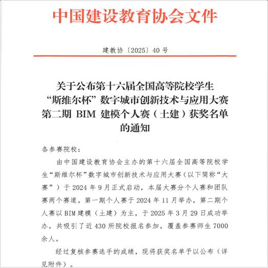 此次获奖,不仅是对参赛学生专业技能的高度认可,也是对建筑管理工程系教育教学成果的一次有力验证。通过参与此次大赛,学生们对行业的最新动态和技术需求有了更深刻的认识,进一步提升了自身的实践技能和创新思维,为未来的学习和职业发展打下了坚实的基础。