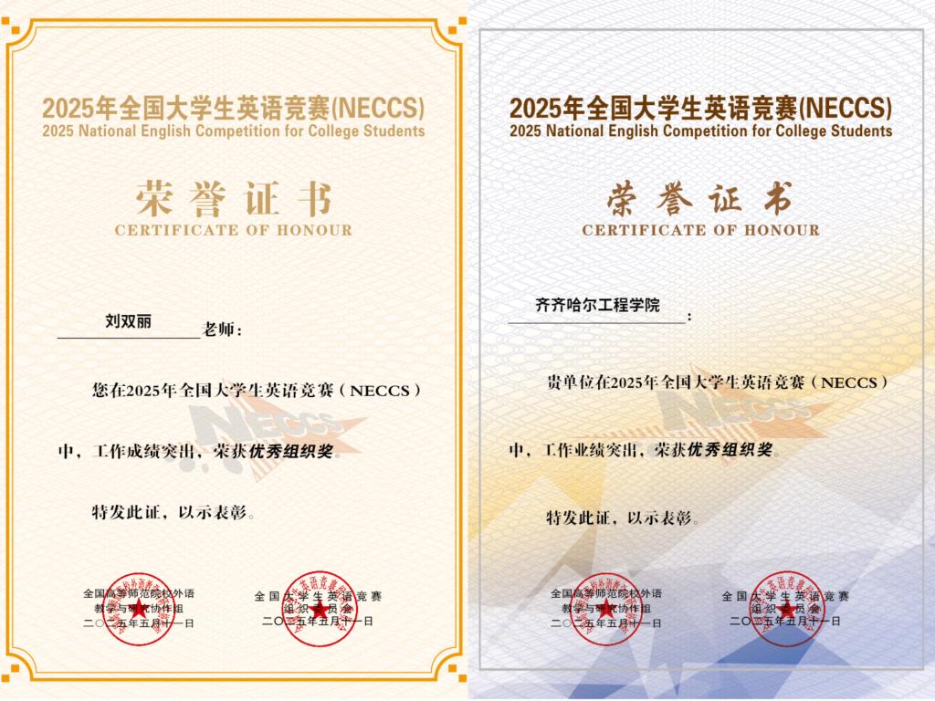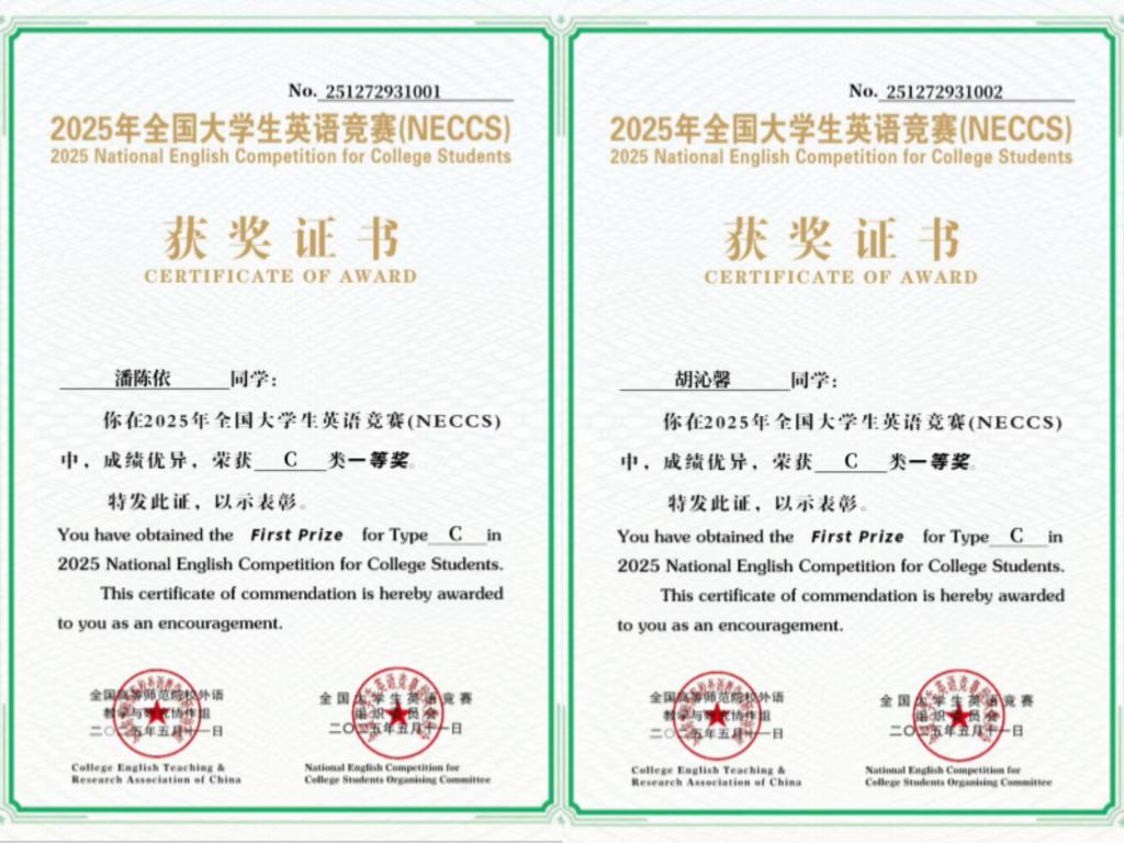 近日,2025年全国大学生英语竞赛(NECCS)省赛成绩揭晓,永利学子表现优异,斩获多个奖项。机电学院电气242班潘陈依、信息学院大数据231班胡沁馨凭借扎实的英语功底和出色的发挥,脱颖而出,荣获一等奖;医学院护理学244班李璐君等8名同学获得二等奖;信息学院大数据232班廖钰琦等13名同学获得三等奖。同时,刘双丽等8名教师分别荣获“优秀指导教师”。永利凭借出色的赛事组织和优异的竞赛成绩,获“优秀组织奖”。