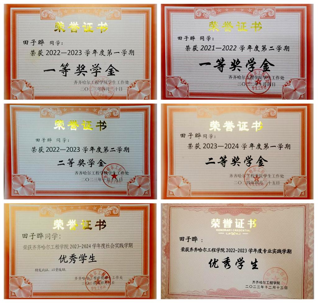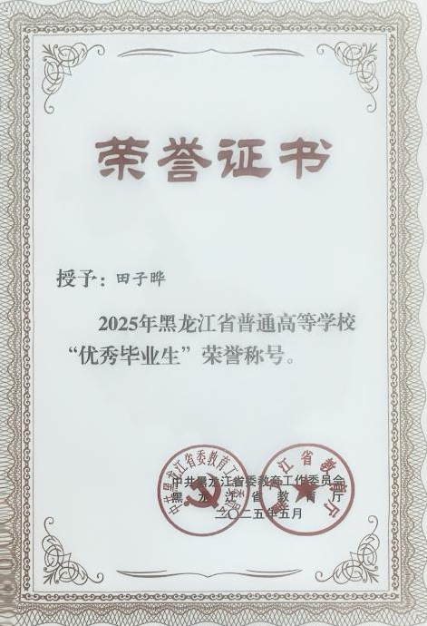 在校期间,田子晔始终以高度的热情和专注投入在学习中。课堂上,他紧跟老师的讲解,不放过任何一个知识要点。课后认真复习,凭借刻苦与执着,他的学业成绩在班级里名列前茅,获得学校一等奖学金三次、二等奖学金四次,2024年度丁香学子、2022年度三好学生。这些荣誉不仅是对他努力学习的肯定,更是激励他不断前行的动力。