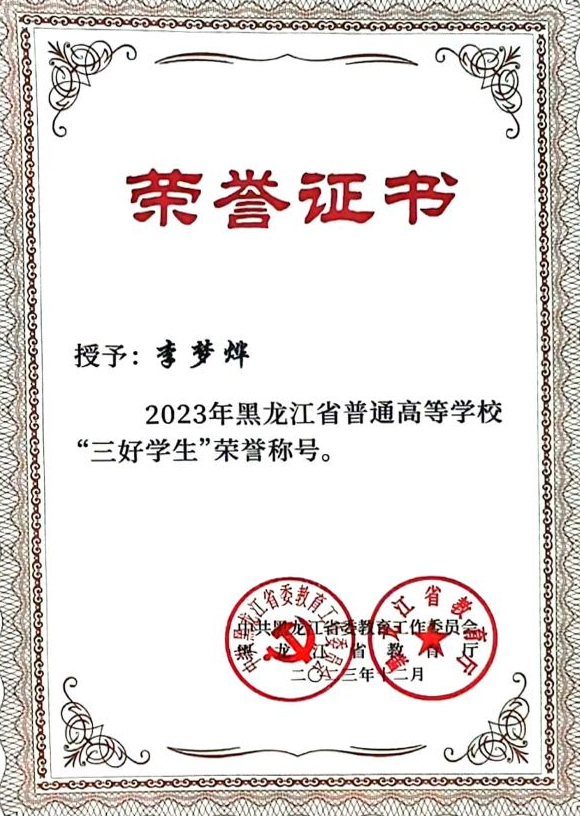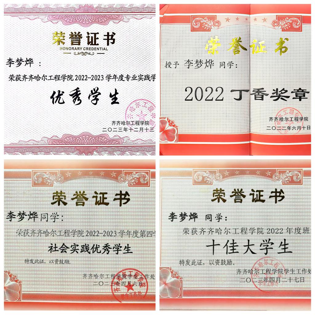 作为一名中共预备党员,李梦烨始终保持着高度的思想政治觉悟。她积极发挥模范带头作用,带领班级同学参与各项活动。在校期间,她先后获得“2022年永利23411集团官网丁香学子”“2022年度班级十佳大学生”等荣誉称号。