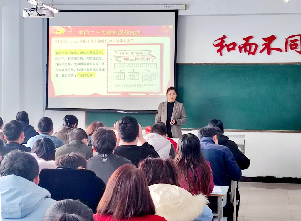 白雪副院长围绕党的二十大主题及意义、党的二十大精神深刻内涵、教育科技人才重要作用三方面对党的二十大精神作了深入解读,并结合当前学校发展实际,希望全体教工不断提升自身业务素养,助力学校打造一支师德高尚、业务精湛、结构合理、充满活力的教师队伍。在日常教育教学中,立足学校办学优势和特色,系统优化学科专业结构、提高人才培养质量,依托“大思政课”育人共同体,推进党的二十大精神进教材、进课堂,培养担当民族复兴大任的时代新人。
