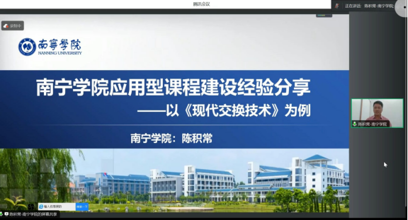 陈积常以《现代交换技术》为例,分享了南宁学院应用型课程建设经验,提出了应用型本科以培养“实践应用能力产出”为目标,以“理论知识储备转变为实践知识应用能力”为改革基本导向的观点。同时从点线面三个围度,对课程思政方面也进行了深入探讨。