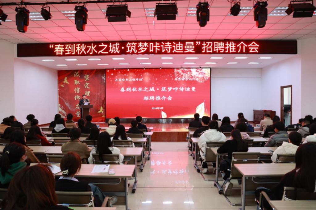 招聘推介会上,陈景鑫代表学校对讷河市委常委、黑龙江省咔诗迪曼集团投资有限公司领导们的到来表示热烈欢迎,介绍了学校创校33年来,始终坚持“政校企合作、产学研融合、教学做合一”的人才培养模式,同时聚焦课程改革,探索“四真三化(FT)”课程建设,以课程为抓手,加强内涵建设,为地方经济发展培养高质量人才。