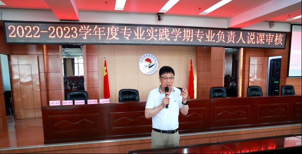 6月13日下午,学校2022—2023学年度专业实践学期专业负责人说课审核在图书馆601报告厅举行。理事长曹勇安、教务长张静出席,教务处副处长冯洁,各系部中心主任、教学副主任及全体专业负责人、任课教师线下参会,其他教学相关人员线上参会,教务处实践教学科科长康琦主持。