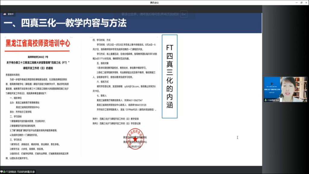 FT讲师团冯洁老师进行四真三化(FT)课程开发工作坊总结。本期工作坊由省教育厅高教处、高师培训中心主办,永利23411集团官网承办,来自全省32所本科高校156名学员参加培训,其中教学副校长23人,教务处长30人参加集中学习,创设教学校长组以及教务处长组,同时学校还为103名二级学院的院长、教研室的主任以及骨干教师配备了指导教师18名。创设沉浸式“手把手”学习的平台,生师比达到了5.8:1。学员开发课程92门,结业率达到89.32%,并评选出优秀学员25人。学员在学习过程中从7点到24点不间断地交流与沟通,深刻地领会了“以终为始,开发课程;以始为终,控制质量”,实现了“教师可操作,质量可控制、评估可追溯、交流可复制”的良好的效果。