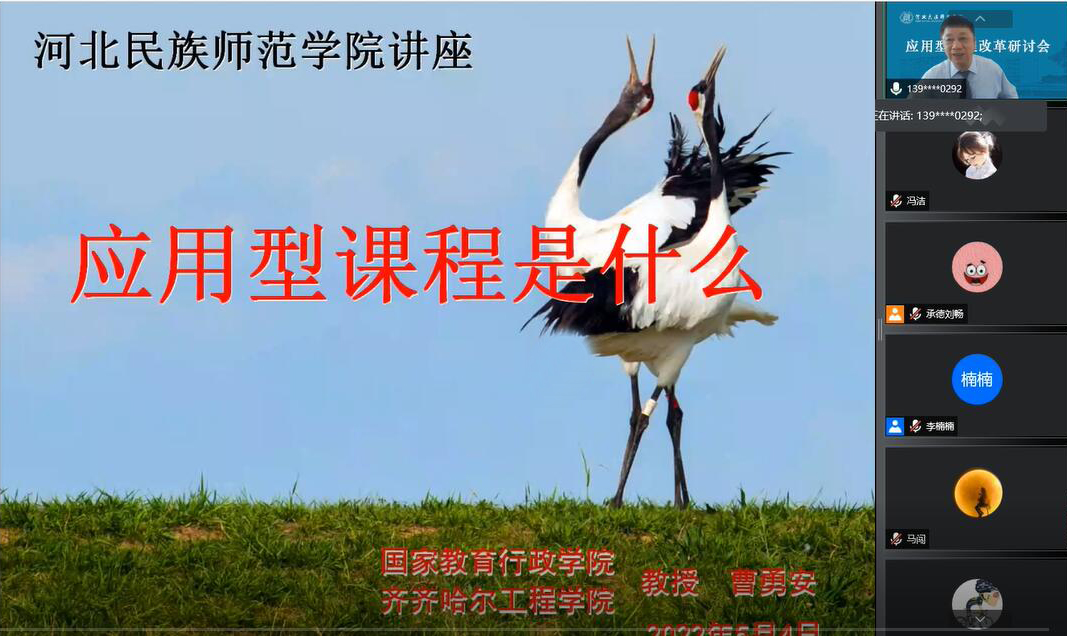 5月4日下午,河北民族师范学院应用型课程改革研讨会在线召开,该校主要领导和全体任课教师参加,理事长曹勇安教授作为出席领导应邀参加,并作《应用型课程是什么》专题讲座。