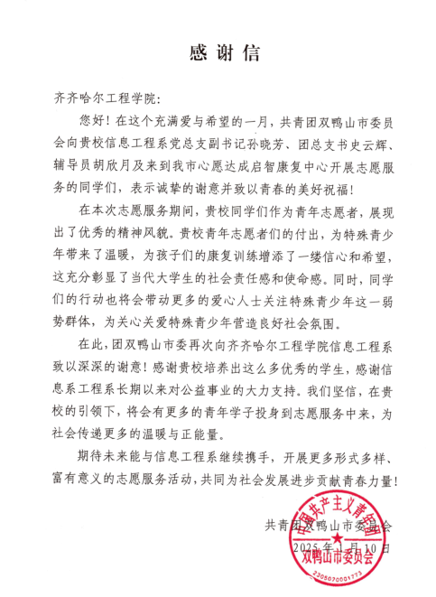 1月9日,信息工程系在社会实践学期期间,赴社会实践基地——双鸭山市“心愿达成”启智康复中心,开展“向光而行,志愿点亮心愿”志愿服务活动。信息工程系党总支副书记孙晓芳、团总支书记史云辉、辅导员胡欣月及系内骨干学生参加。