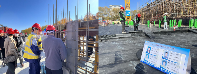 建筑工程系校外课堂的特点在于涵盖了教学样板展示区和实践教学区两部分。在教学展示区,土木工程、工程管理专业的学生在教师国贺阳的指导下,进行学生团队模拟作业。在实践教学区,建筑工程系土木专升本22级学生在各指导教师的带领下,以团队的形式进行不同岗位的“外轮+内轮”作业,其中在钢筋加工区由李春雨和王雪老师进行钢筋加工指导作业;在混凝土试块制作区由张晓庆和杨晓明老师为学生进行操作指导;梁忠强老师在泳池区域的人行斜道为学生进行搭设指导;朱同威老师在地库顶板进行脚手架支撑体系为学生进行搭设指导;梁海老师在地库顶板为学生进行防水卷材铺设指导;李智慧老师在冰上运动中心底板地库为学生进行工程测量指导。各组学生通过团队合作,完成具体工作任务,指导教师针对学生作业给予点评和优化建议,真正实现校外课堂的实践教学的良好效果。