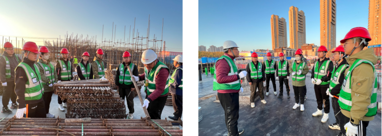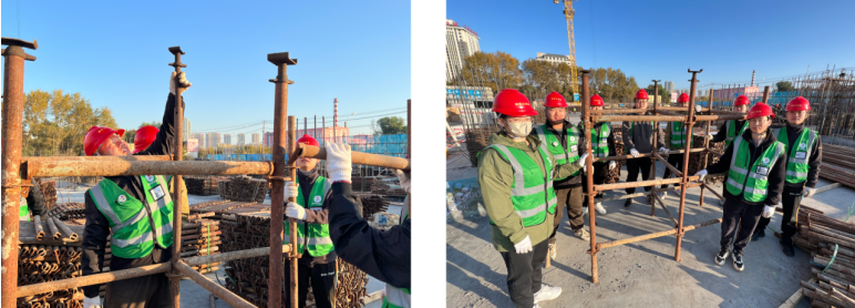 此次竞赛的举办也充分获得了合作企业的鼎力支持,其中中建二局项目总工程师孙大伟为现场同学讲解模架支撑体系,在此期间,我系《土木工程施工技术与组织》《建设工程监理》《房屋建筑学》等校外课堂的任课教师贺全德、徐喜辉、梁海也在现场对脚手架搭设、改性沥青卷材热熔粘结的操作要点及其实施方法等内容进行答疑解惑,学生们通过拍摄视频、拍照、要点记录等多种形式开展学习,土木专升本222班学生王秋表示:“能够接触一线的技术人员,以技术人员的工作标准和流程为标准学习,让我们深刻认识到理论知识在实践中的应用,这是校内课堂中学不到的,我们一定会珍惜校外课堂这来之不易的机会”。