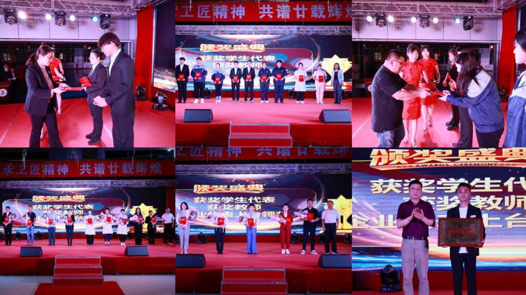校领导依次为荣获“优秀实习生”“爱岗敬业奖”“创新实践奖”“实习贡献奖”“最大进步奖”“最受企业欢迎奖”的学生代表及优秀指导教师颁奖。
