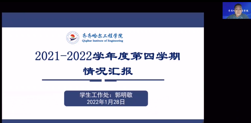 根据《永利23411集团官网2021—2022学年度第四学期实施方案》的要求,1月28日下午,学校在线召开2021-2022学年度第四学期阶段总结会。副院长张振笋、建筑工程系、管理工程系主任陈景鑫、机电工程系主任郭磊、信息工程系负责人刘春媛、健康与护理系负责人郭玲玲、各系学生工作副主任及全体辅导员和学工处老师参会。会议由学生工作处副处长郭明敬主持。