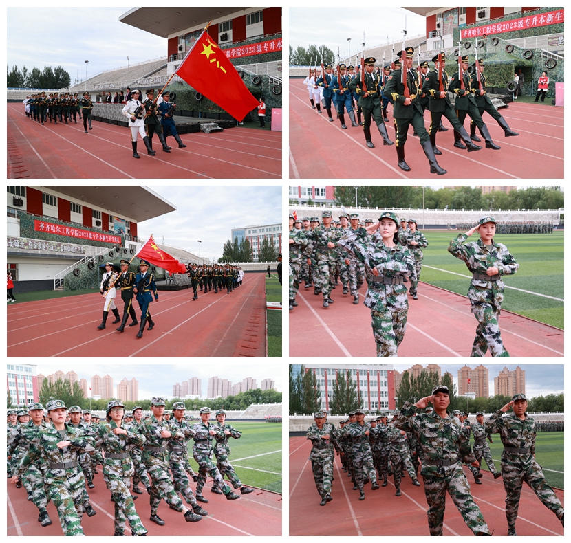 在学长教官团团长孙志屹的指挥下,全体新生以分列式、军体拳、匕首操等精彩表演,展示军训成果。