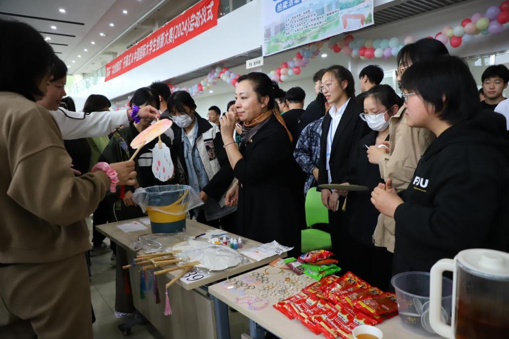 在“众创集市”上,各种独具特色的卡通人物、DIY饰品和扇子成为了最受欢迎的热门商品。市集内人头攒动,叫卖声此起彼伏,形成了一幅生机勃勃的创业图景。