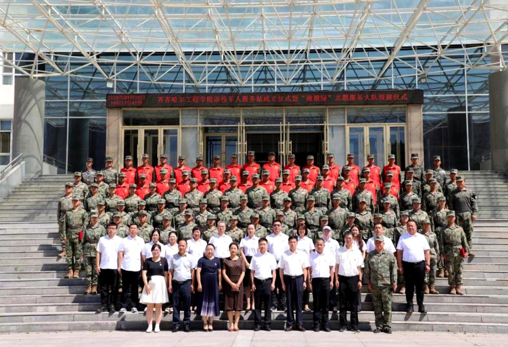 7月22日上午,学校在图书馆601报告厅举行退役军人服务站成立仪式暨“橄榄绿”志愿服务队授旗仪式。市退役军人事务局党组书记、局长吴寒,党组成员、副局长杨军,市退役军人服务中心主任刘成,龙沙区退役军人事务局局长徐万柱等领导,学校党委副书记、常务副院长陈景鑫、学生工作处负责人王丽萍,武装部副部长孙晓芳,各系党总支副书记、辅导员、“橄榄绿”志愿者代表及学长教官团全体成员参加仪式。
