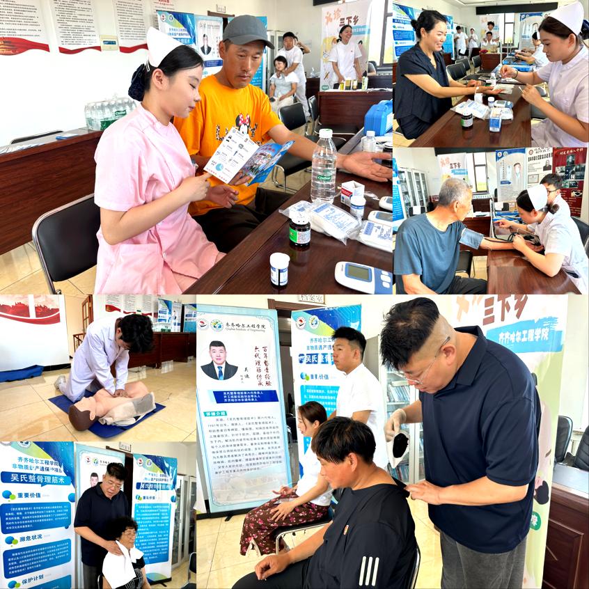 7月21日,实践团队赴昂昂溪区水师营衙门满族村开展实践活动。上午,团队在党群服务中心通过专题讲座、知识竞赛和道德讲堂等形式,向村民宣讲党的创新理论与乡村振兴政策。下午,团队在文化活动室为95名60岁以上老人提供健康义诊服务,包括血压、血糖检测等项目。活动特别邀请龙沙区非遗“吴氏整骨理筋术”传承人吴迪为25名慢性病患者进行推拿按摩治疗。护理专业师生现场演示了心肺复苏、海姆立克急救法等实用技能,并讲解夏季传染病防控知识,同时发放《慢性疾病宣传册》百余份。整个义诊活动流程规范有序,村民积极配合排队等候。多位老人说:“这样的服务让我们不出村就能享受专家诊疗,既贴心又暖心。”此次活动切实将健康服务送到了村民家门口。