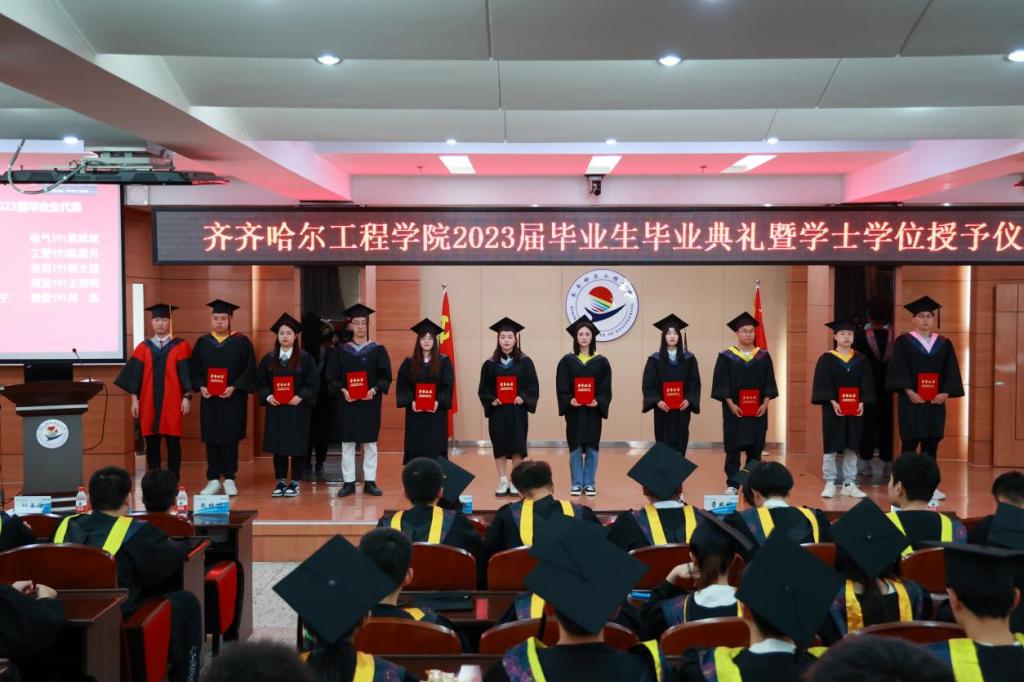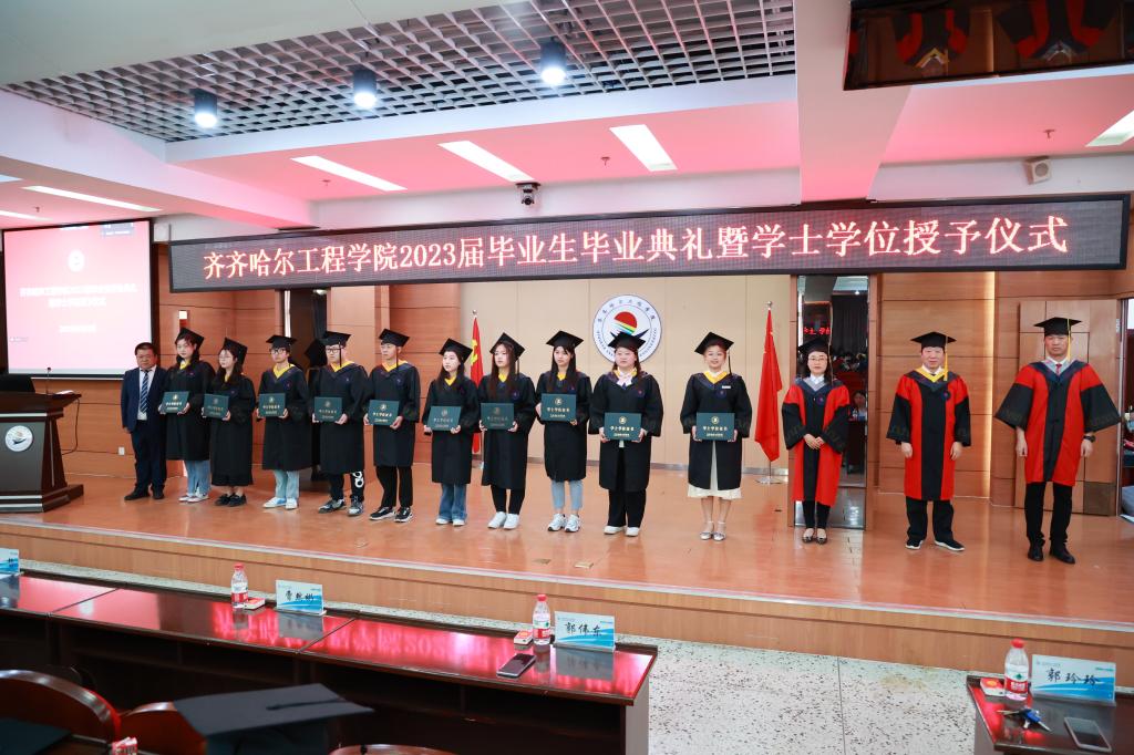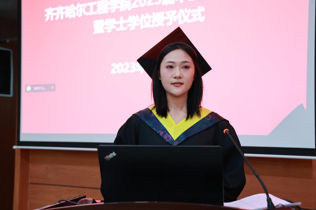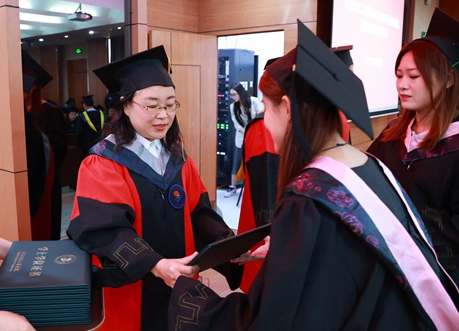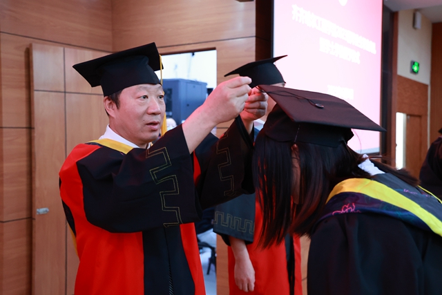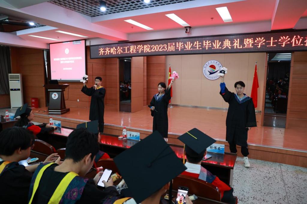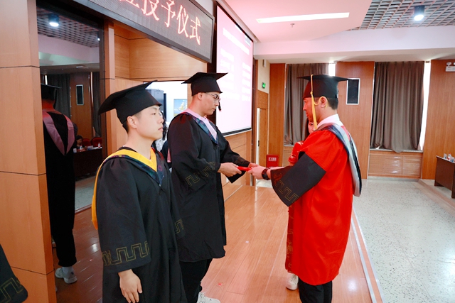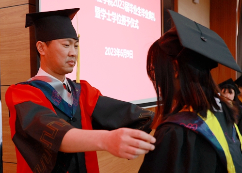 毕业生代表在《加冕进行曲》中依次走上主席台,院长曹然彬、党委书记郭伟东、教务长张静为毕业生代表正衣冠、扶正流苏、颁发学士学位证书。学校承诺,今后每年的毕业典礼都会为未能到现场接受拨穗的学生留出位置,欢迎他们回母校重温人生的重要时刻。
