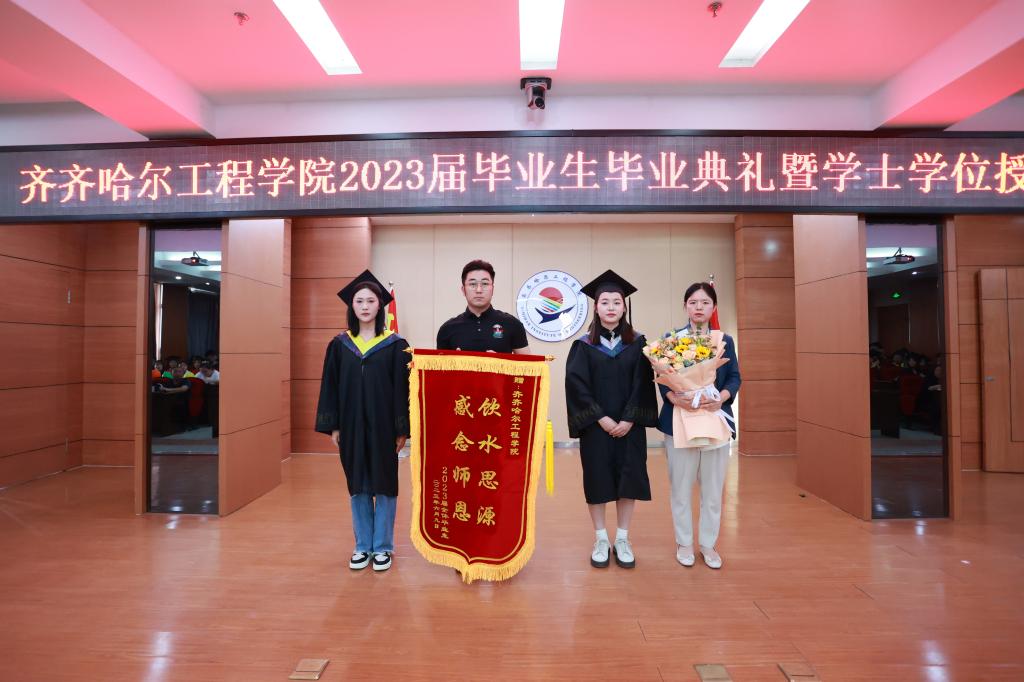 2023届优秀毕业生代表向学校赠送锦旗和鲜花。