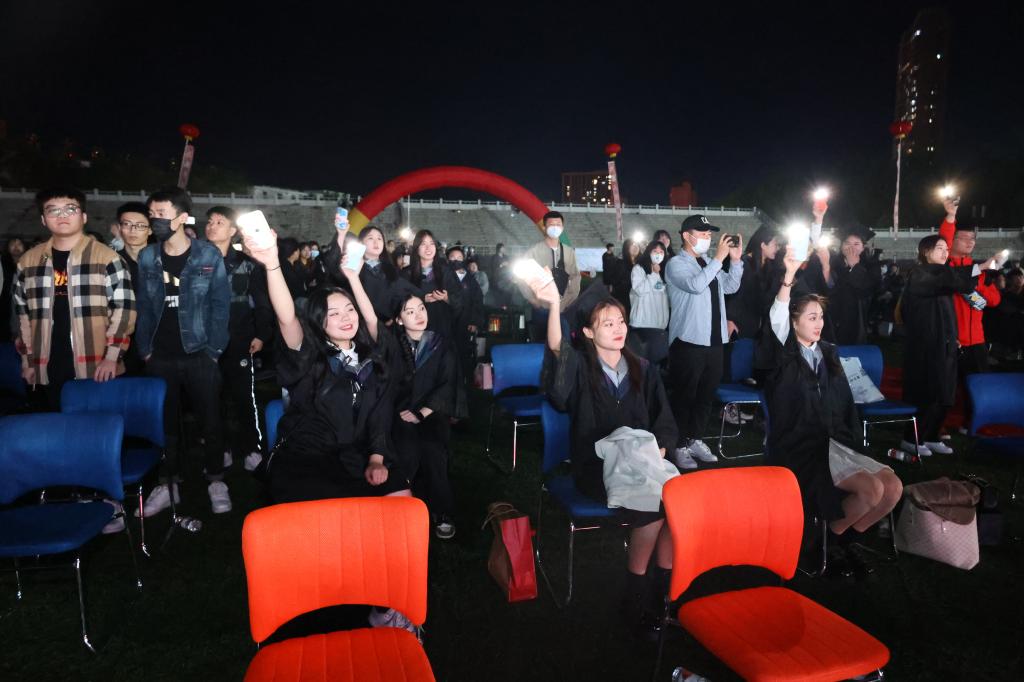 “上饺子喽”,伴随欢快的音乐,一碗碗包含着学弟学妹浓浓的祝福的热气腾腾的饺子送到在场每一位毕业生手里,夜空里礼花绽放,映照着每一张幸福的笑脸。