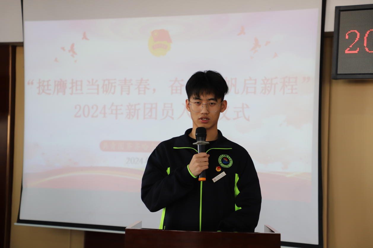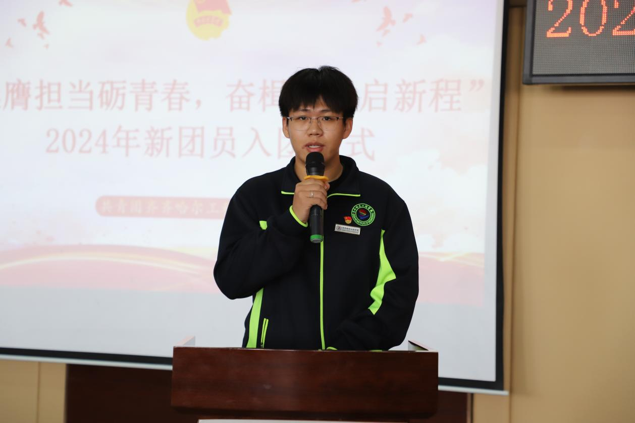 老团员代表、机电工程系机械221班孙显浩发言,他表示,入团不只是形式,更应履行团员职责,不断提高自身素质和修养,为学校发展贡献自己的力量。