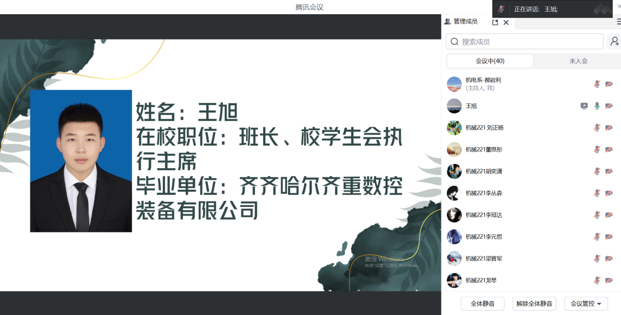 王旭在校期间表现优秀,曾担任班长及校学生会执行主席等职务。毕业后入职齐齐哈尔齐重数控装备有限公司。