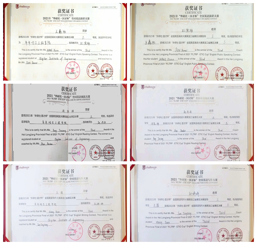 2021年“外研社·国才杯”全国英语演讲、写作、阅读大赛黑龙江省赛区决赛成绩于近日公布。永利高原、冯佳祥同学分获阅读比赛二等奖和三等奖;王鑫旭获演讲比赛三等奖;王圆、梁晨获写作比赛三等奖;大学外语教师孙德梅...