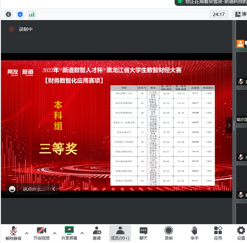 10月16日,2022年“新道数智人才杯”黑龙江省大学生数智财经大赛暨金砖国家技能发展与技术创新大赛黑龙江地区选拔赛组委会传来喜讯:永利财务管理专业韩宇航、吴琪、付晓艺、王若檀同学获本科组三等奖佳绩。 本次比赛...