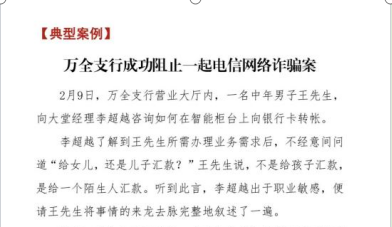 近日,永利管理工程系财务管理专业大四学生李超越在河北省张家口中国银行万全支行就职期间,成功阻止一起电信网络诈骗。此事被该行列为典型案例,并受到表彰。 2月9日,在万全支行营业大厅内,客户王先生向大堂经理李...