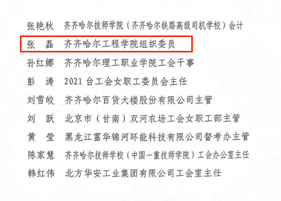 3月6日,齐齐哈尔市总工会女职工委员会发布了2022年度“关于女职工干部做合格‘娘家人’选树结果的通报”。学校工会组织委员张磊老师获得选树通报。 【责任编辑 王凡】