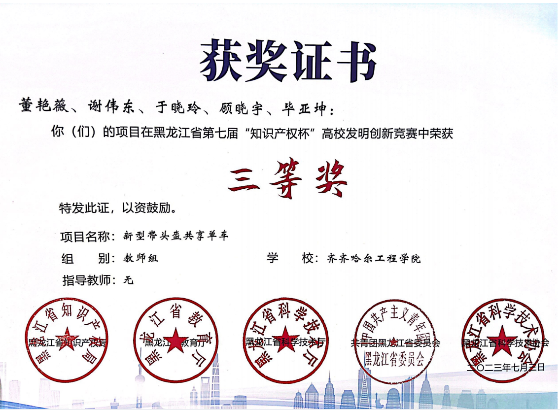 近日,黑龙江省第七届“知识产权杯”高校发明创新竞赛圆满闭幕。永利三支队伍获奖,一支获教师组三等奖,另两支获学生组三等奖。据悉,该竞赛自2011年创办以来每两年举办一次,由省知识产权局、教育厅、科技厅、团省委和省科协共同主办,已成为我省高校师生展现创新才华、迸发创造活力的一项重要赛事。永利由董艳薇老师带队,谢伟东、于晓玲、顾晓字、毕亚坤老师为团队成员创作的作品——“新型带头盔共享单车”获教师组三等奖...