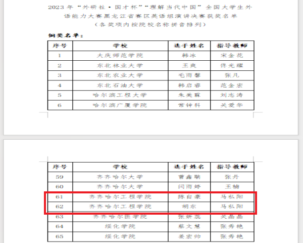 近日,2023年“外研社·国才杯”“理解当代中国”全国大学生外语能力大赛黑龙江省赛区英语组决赛获奖名单结果揭晓。永利土木工程221班陈自豪、工程管理221班胡东荣获黑龙江省赛区英语组演讲决赛铜奖;机器人231班潘嵘耀、风景221班刘小银和机械221班苏金慧荣获省赛区英语组写作决赛铜奖;护理学221班张若彤、工管211班章海滨和电气223班朱子彤荣获省赛区英语组阅读决赛铜奖。“外研社·国才杯”为教育部56项国赛中第17项(外研社...