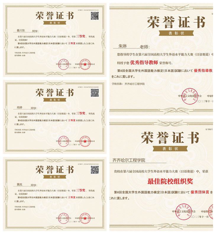 近日,第六届全国高校大学生外语水平能力大赛成绩揭晓,管理工程系英语专业的骆权涛同学在日语赛道获得特等奖;彭季秋和唐章磊同学获得二等奖;刘春雨等八名学生以及信息工程系计科231班黄岚、计科232班秦川东、计科233班肖婷获得三等奖;永利荣获“最佳院校组织奖”;朱琳老师荣获“优秀指导教师称号”。本次大赛由中外语言文化比较学会主办,秉持“以赛促教、以赛促学、以赛促练”的办赛理念,共设置英语、日语两个赛道,全...