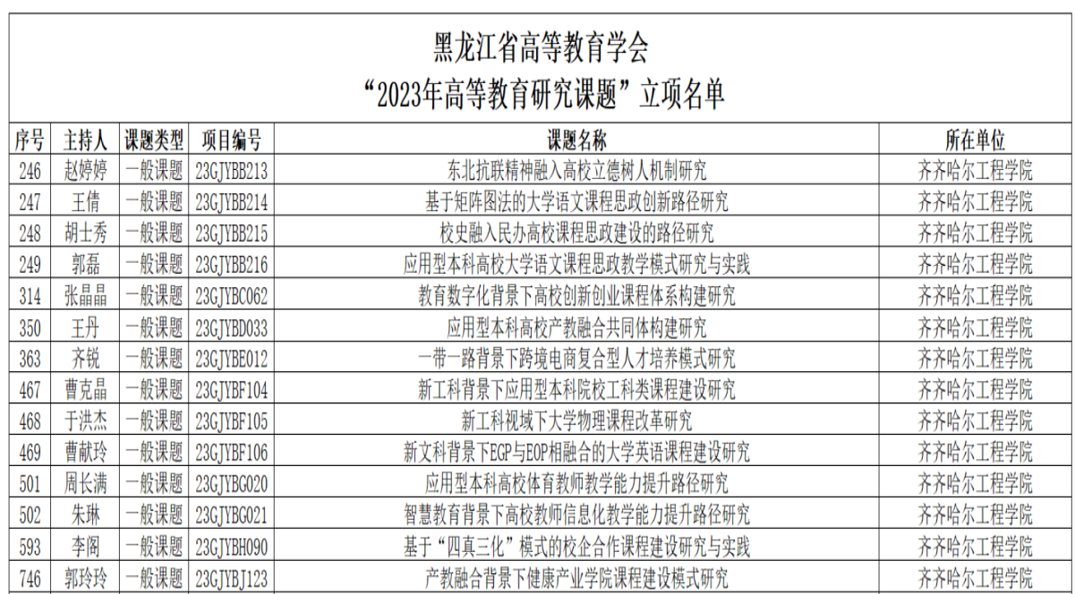 近日,黑龙江省高等教育学会公布“2023年高等教育研究课题”立项评审结果,学校赵婷婷申报的《东北抗联精神融入高校立德树人机制研究》等14项课题获批立项。近年来,永利广大教师紧紧围绕学校应用型课程建设实践,深入开展教育教学及高等教育相关研究,积累了较为丰富的科研基础。此次获批的课题既是对过去永利相关研究的总结提升,也是进一步加强高等教育研究的新起点,学校科研处将指导各课题组做好开题、过程管理、结题等...