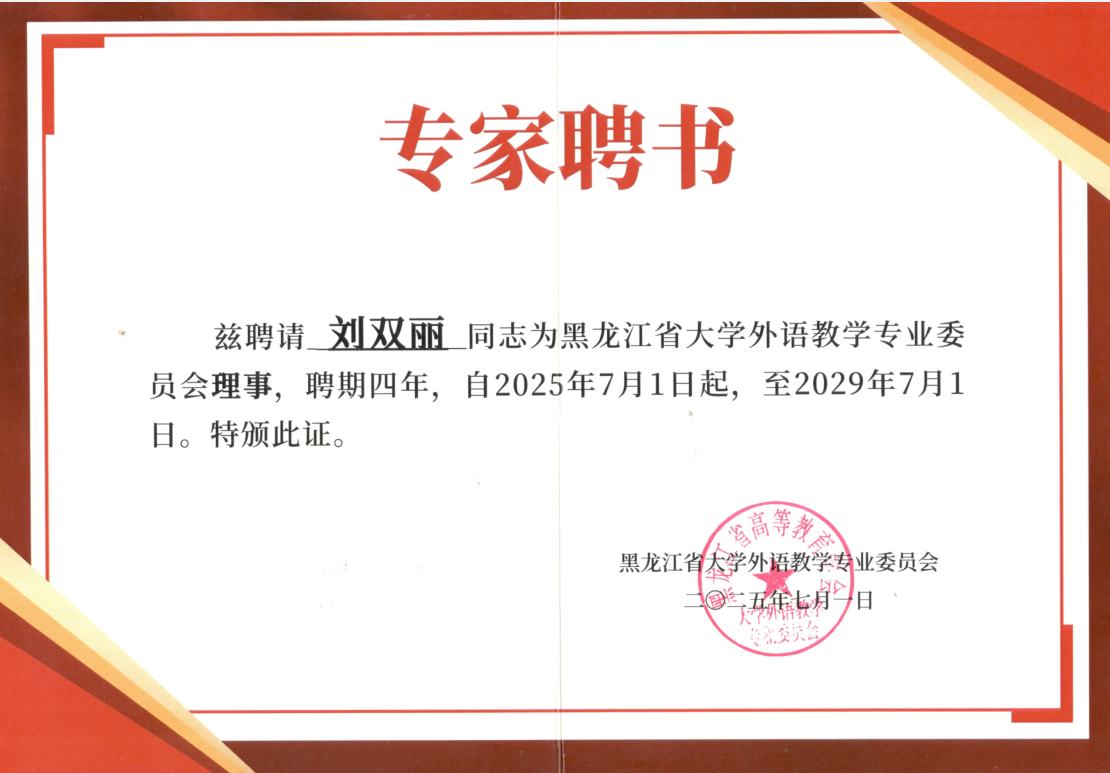 近日,黑龙江省大学外语教学专业委员会向永利通识教育学院刘双丽教授颁发聘书,聘任其担任该专业委员会理事,聘期四年(2025年7月1日—2029年7月1日)。这一任命是对刘双丽在外语教学领域认可,也彰显了永利公共外语教学改革的显著成效。黑龙江省大学外语教学专业委员会是省内外语教育领域的权威指导机构,承担外语教学标准制定、教师培训、教学评估等职能。作为新任理事,刘双丽将参与全省大学英语教学改革规划,重点推动...