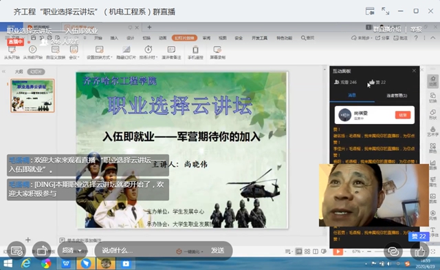 4月23日晚,由学生发展中心主办的“职业选择”云讲坛系列活动在钉钉信息化平台启动,齐市龙沙区武装部政委尚晓伟应邀为300余名应届毕业生作“入伍即就业”专题报告。 尚政委以对现有征兵政策的解读切入,结合同学们所...