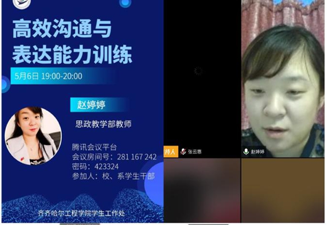 为提升学生干部的综合素质能力,更有效地开展服务学生,学生工作处组织进行2020年学生干部线上培训。5月6日晚,思政教学部教师赵婷婷做培训第一讲《高效沟通与表达能力训练》。 本次培训由团委张云惠老师主持,学生工...