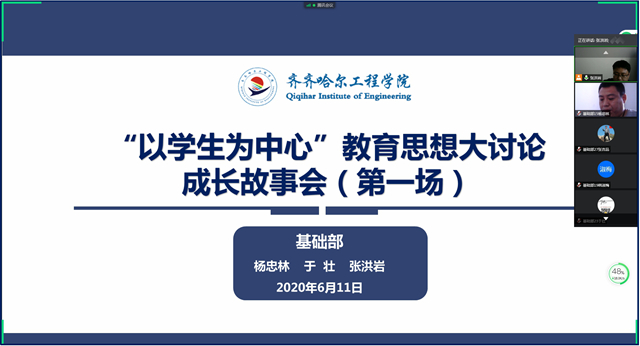 6月11日下午,基础部在线组织部门第一场故事分享活动,“部门发展历程团队”推选的教师代表杨忠林、“教学科研与改革团队”推选的教师代表于壮分别做故事分享,副主任张洪岩主持活动并分享个人成长故事,蒋春艳副院长...